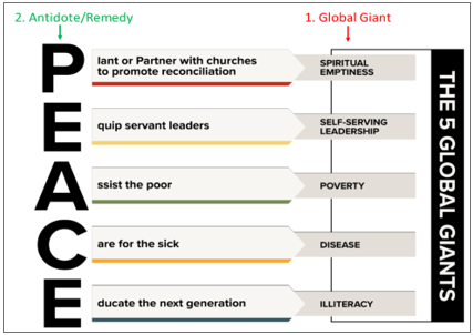 5. A Wholistic Approach to Missions: The world is full of problems. Some are small and some are huge. As we consider the problems facing the world today, we have concluded that there are five giants – There are five pervasive problems that affect billions of people. There are 5 universal global giants laying siege to our fallen world. Each giant has its own antidote, or remedy. And all remedies are something the church can provide.